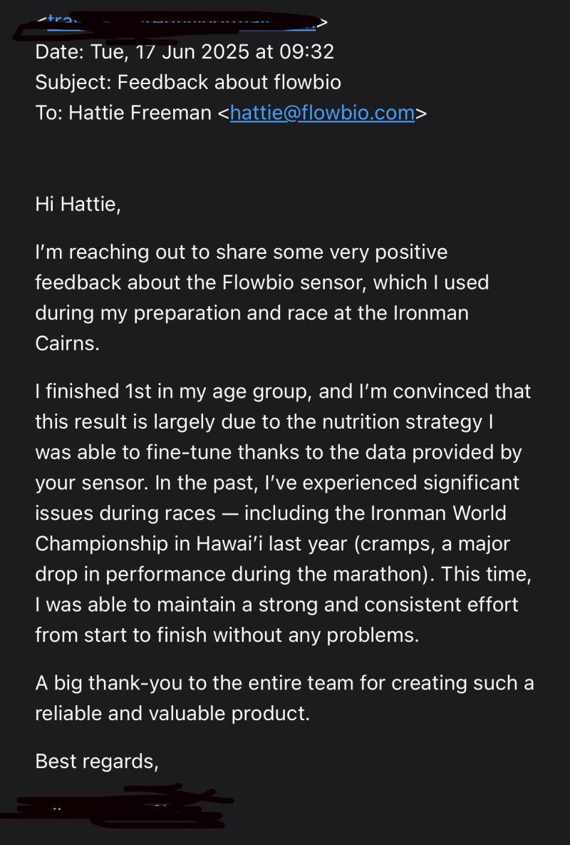 At the core of FLOWBIO is the world’s most accurate sweat sensor, measuring your water and sodium loss as it happens. Paired with the FLOWBIO App, raw data is transformed into actionable hydration insights, tailored to your physiology and training conditions — giving you the clarity to train smarter, race stronger, and recover with purpose.